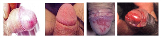 (2)环状溃烂性包皮龟头炎:在龟头和包皮上,可见红斑,逐渐扩大,呈环状,可形成浅表性溃疡面。
