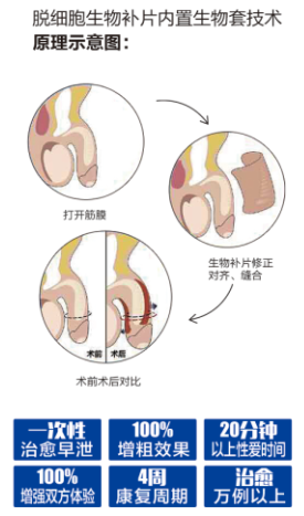 作为此次“2017脱细胞生物补片治疗早泄大型临床技术高峰论坛”的主要推广技术“脱细胞生物补片内置生物套技术”被成功引入邯郸燕赵中医医院。燕赵男科特别与北京三甲医院达成战略合作,并被北京三甲医院授予“脱细胞生物补片行‘内置生物套’早泄技术临床应用协作单位”称号,该技术在邯郸燕赵男科的顺利开展有力地彰显了燕赵男科在邯郸男科领域的领军地位。采用脱细胞异体真皮基质,(脱细胞真皮基质(aoellular demnal matrix,ADM)是近十年国内外兴起的一种新型组织代替物。这种基质是用物理、化学等方法将皮肤中的表皮层及细胞成分彻底去除仅保留真皮中含胶原网架的细胞外基质而得到的,具有创面覆盖、组织缺损填充、引导组织再生和支架等作用。)依据神经性早泄治疗原理,处理末梢神经的同时,为主神经植入脱细胞真皮基质,增加主神经软组织厚度,彻底隔离主神经摩擦。既有效降低患者各部位敏感性,又确保关键部位有快感,彻底告别十几年来男科治疗早泄单纯阻断末梢神经、埋线降敏末梢神经的历史。